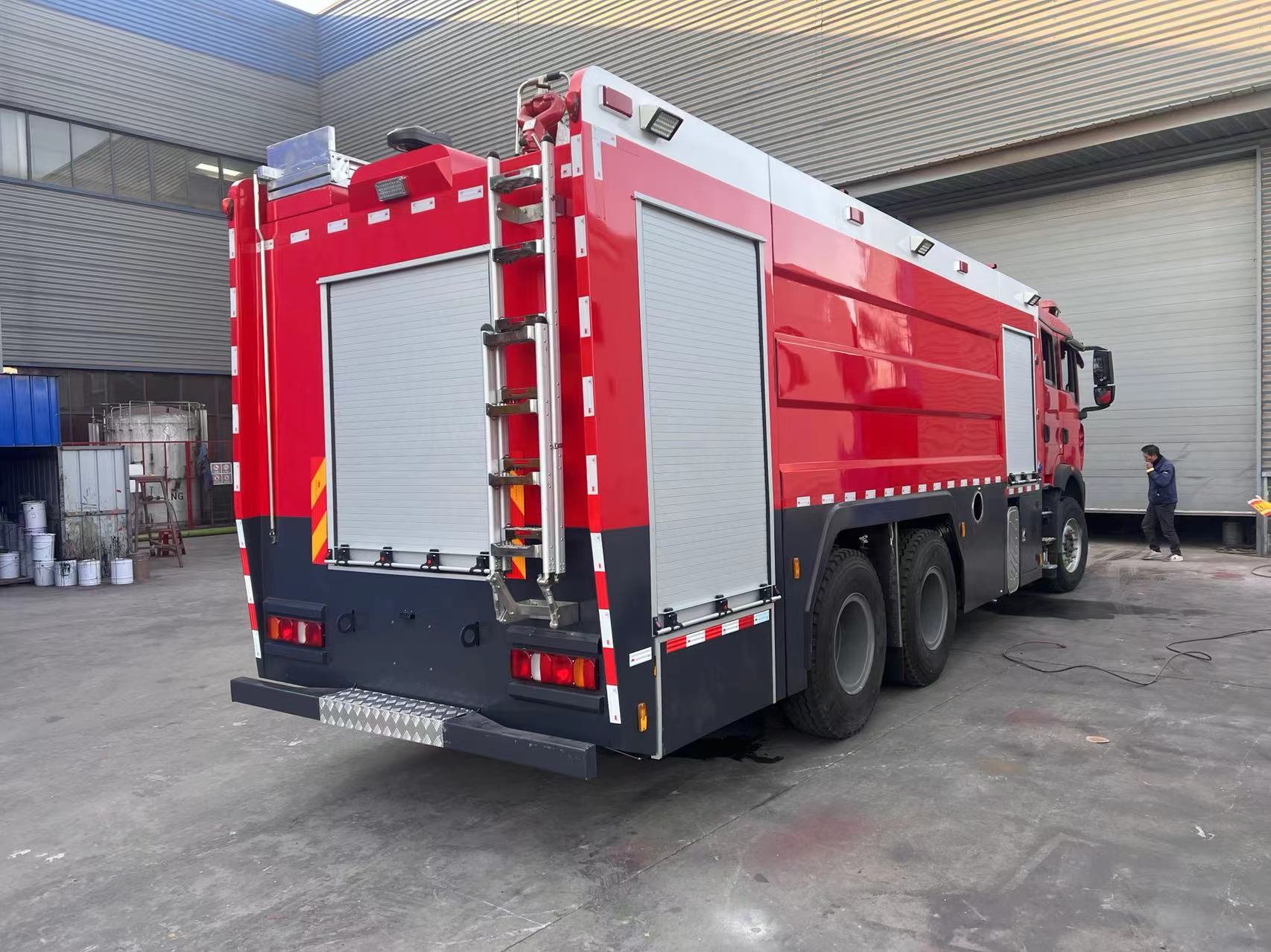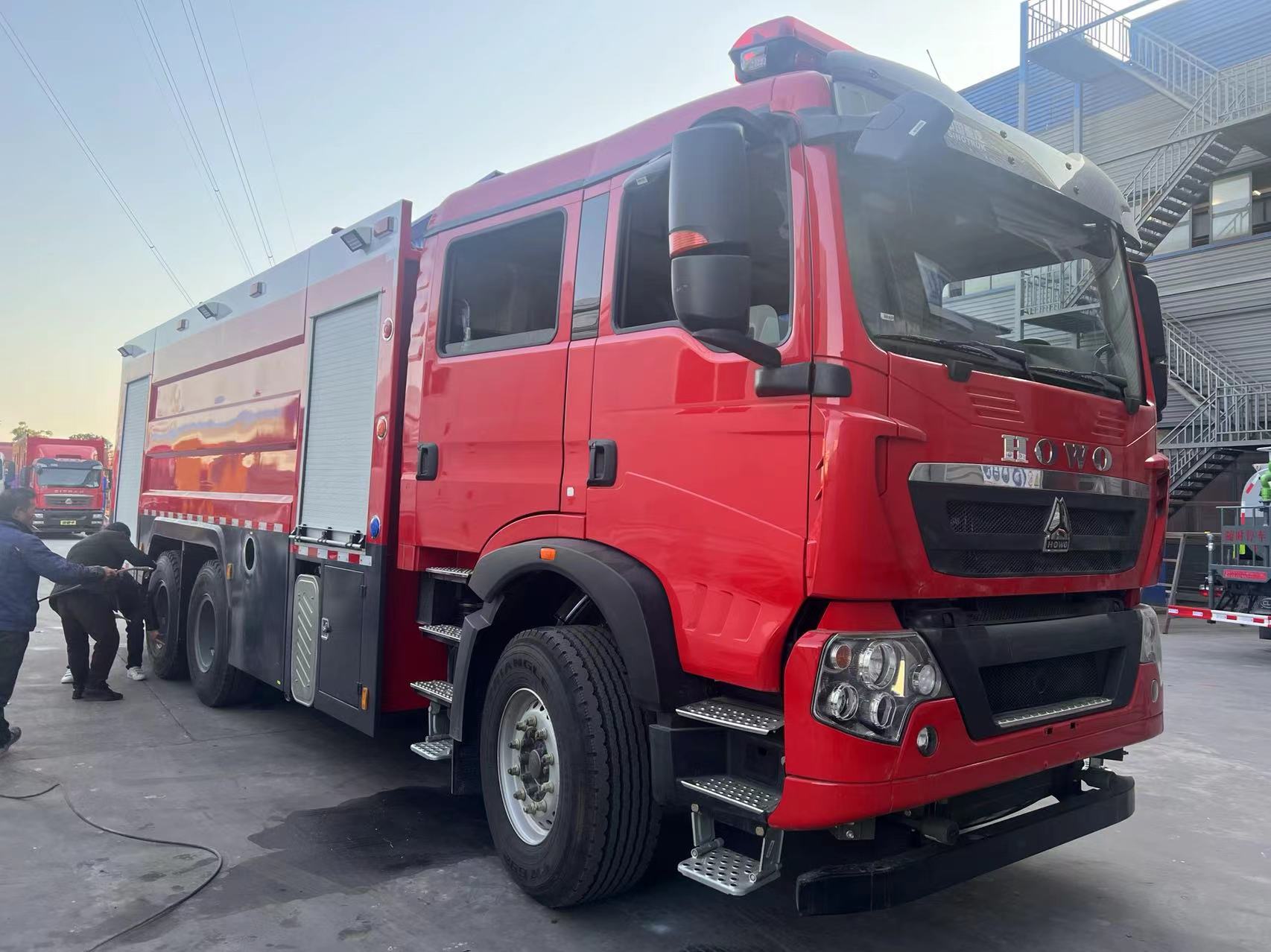豪沃后双桥泡沫干粉联用消防车采用中国重汽集团济南卡车股份有限公司生产的豪沃型载重汽车二类底盘,底盘型号:ZZ5357TXFV464MF5,最高车速101km/h。原装四开门双排座驾驶室,带原车空调,原车仪表板处设置消防操纵仪表板及警灯控制盒;后排座位靠背设置四具空气呼吸器专用靠背及固定夹具,乘坐舒适;驾驶室可翻转,便于发动机维修。上装包括泵房、器材箱、水罐、泡沫罐和干粉罐等,整车载液量为水5500L、泡沫3000L,干粉2000L。水罐采用优质Q235碳钢板、泡沫罐采用304不锈钢焊接而成,干粉罐体材质为Q345R。装备CB10/360低压消防泵、PL8/48型两用消防炮、PF30干粉炮。该车广泛用于大中城市消防队、石油化工、厂矿企业、港口和码头等场所,可扑救大型油类火灾和一般物质火灾。
